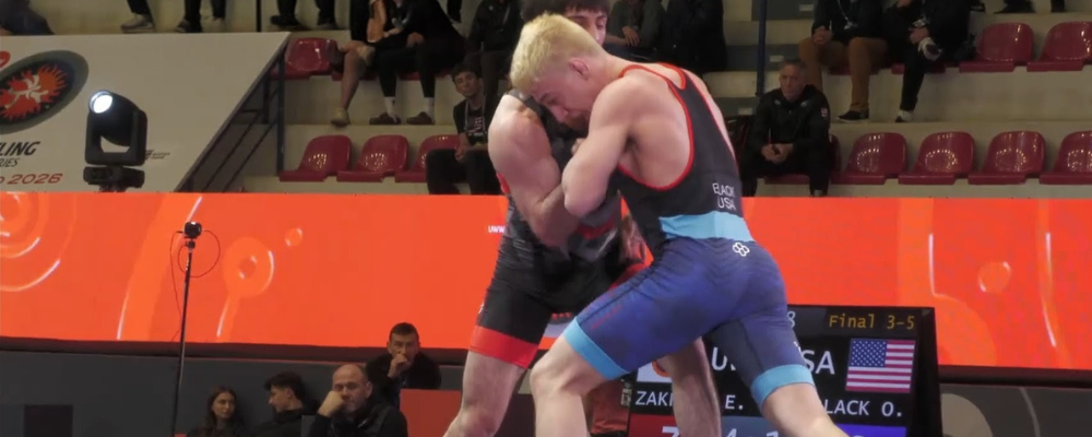 In the bronze round stood ’24 U20 World gold/’25 silver Erzu Zakriev from Russia, who himself had gotten past Nutter prior in the tournament. Unlike Black’s first four bouts on Saturday, this one did not avail offensive points on his behalf. Zakriev responded amid an exchange near the edge to maneuver behind for a takedown and soon followed with a four-point lift that impacted off the boundary. The US corner challenged; the sequence was then reviewed and the scoring was upheld, but with an added point for Zakriev, whose lead had ballooned to 7-0. There were moments in the second period when it appeared that the official(s) might provide Black with a passivity/par terre chance, but they did not, this despite Zakriev’s growing hesitance to meaningfully engage. With the match winding down, Zakriev forced Black out of bounds to collect one more point, thus signaling the end of the match. The bronze went to Zakriev while Black had to settle for 5th.
